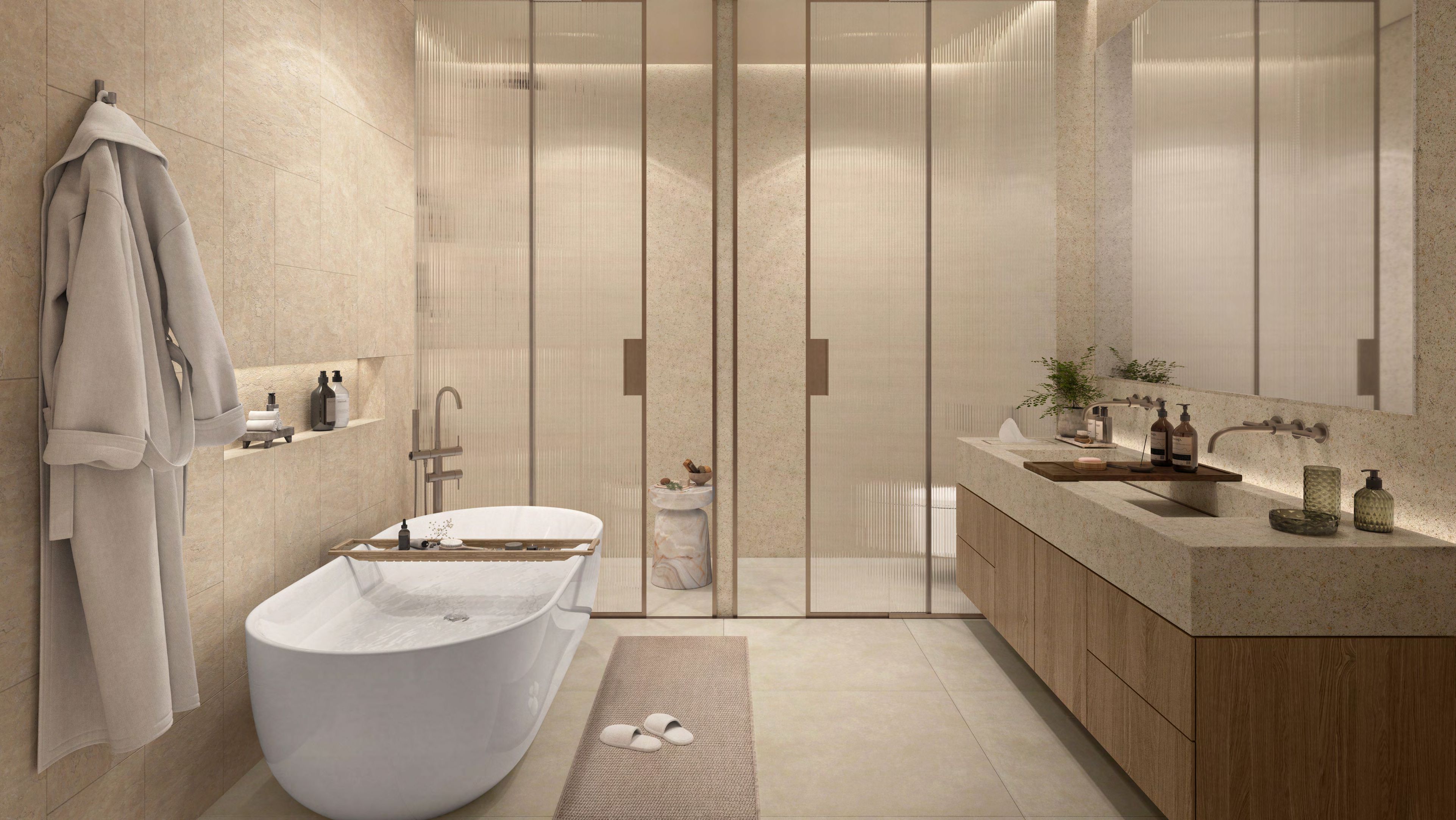 Residents benefit from indoor/outdoor pools, spa facilities, salt cave, sauna, cold plunge, yoga/mindfulness areas, gym, landscaped gardens, co-working spaces, children’s play zones, and wellness concierge services.